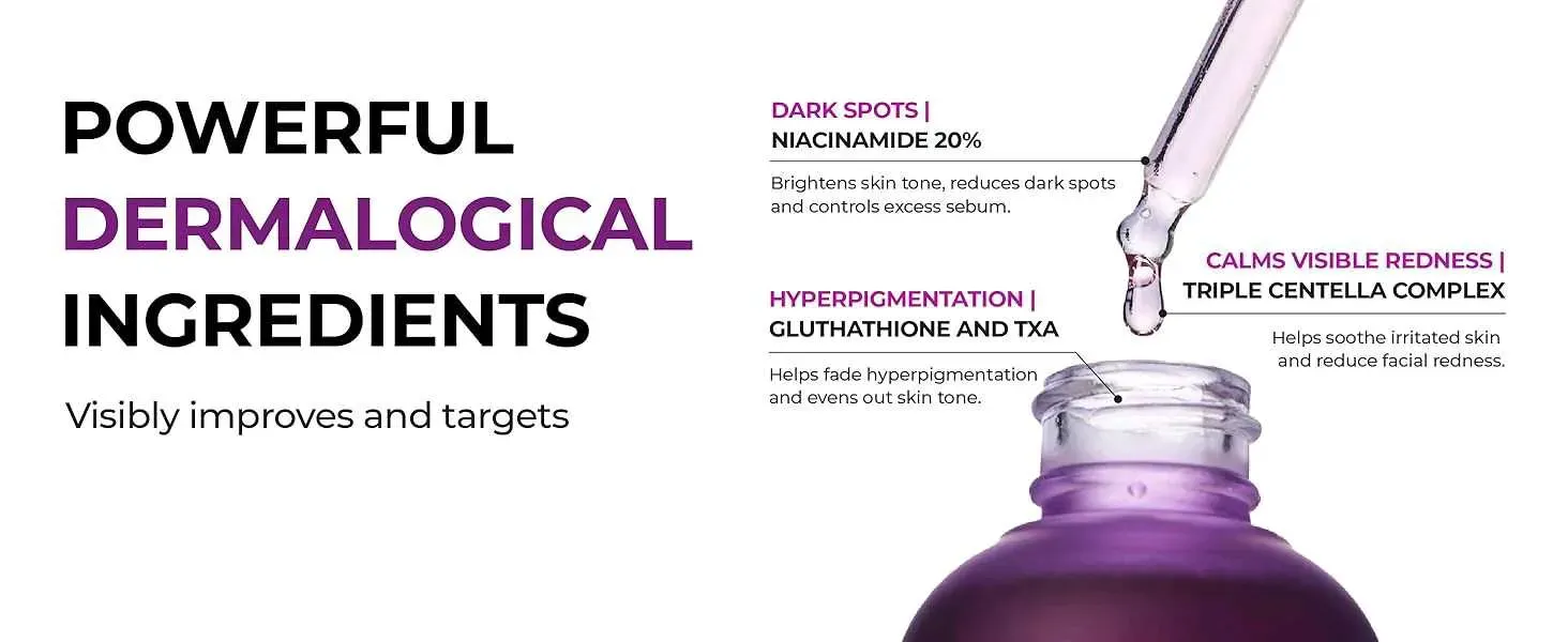 Avanzado cuidado coreano de la piel con 20% de niacinamida, glutatión y TXA que reduce visiblemente la pigmentación y unifica el tono de la piel, logrando un cutis más claro y luminoso en solo 2 semanas de uso diario constante.