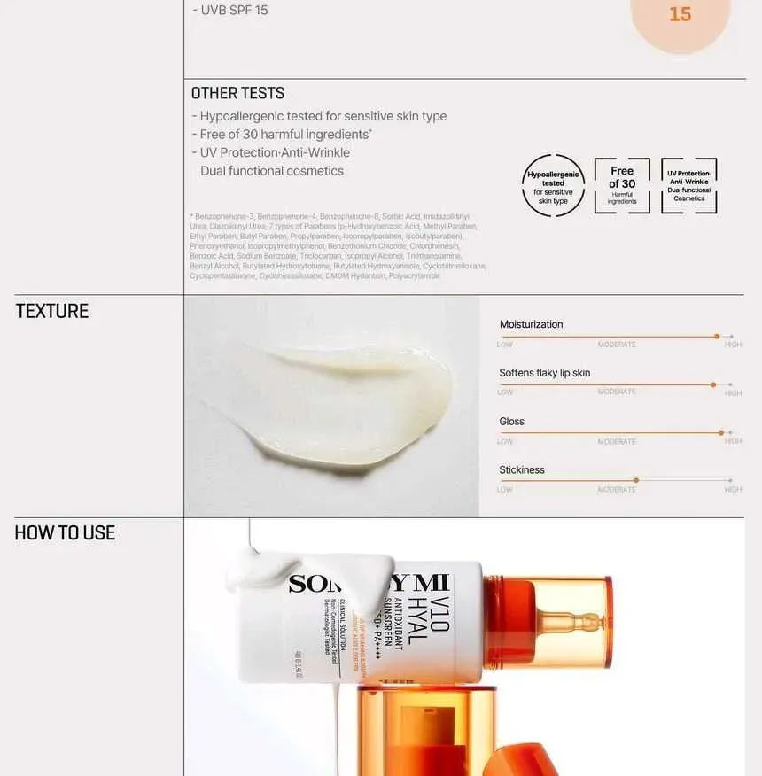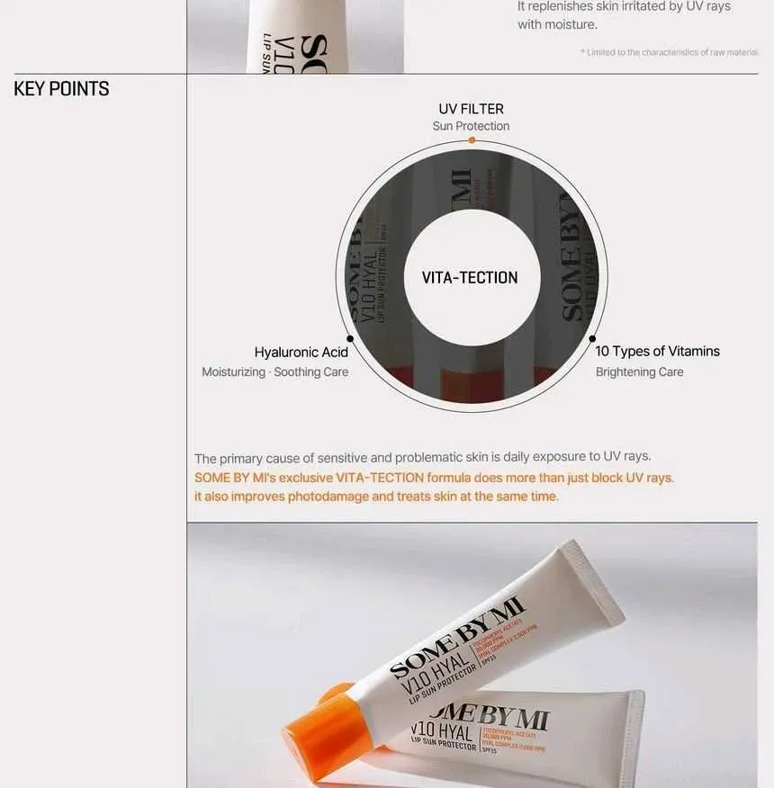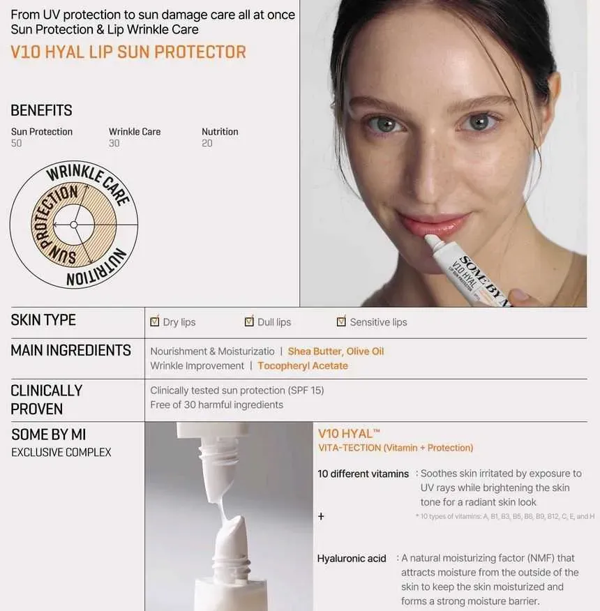 SOME BY MI V10 Hyal Lip Sun Protector es un protector solar labial clínicamente probado y eficaz que contiene SPF15. Utiliza manteca de karité, aceite de oliva y acetato de tocoferilo para brindar una hidratación intensa y brillante. Con 10 vitaminas diferentes y ácido hialurónico, este potente báls...