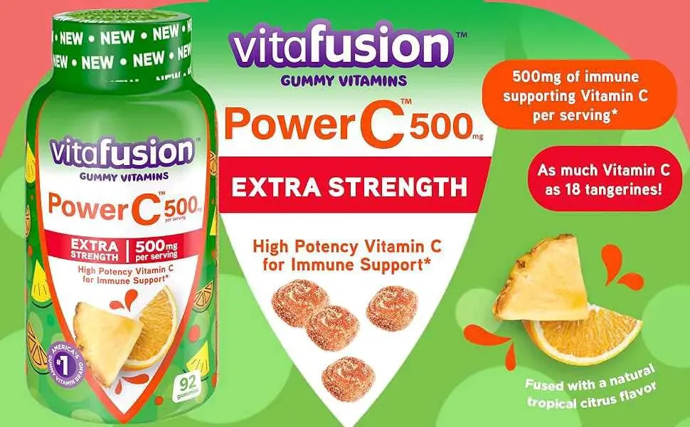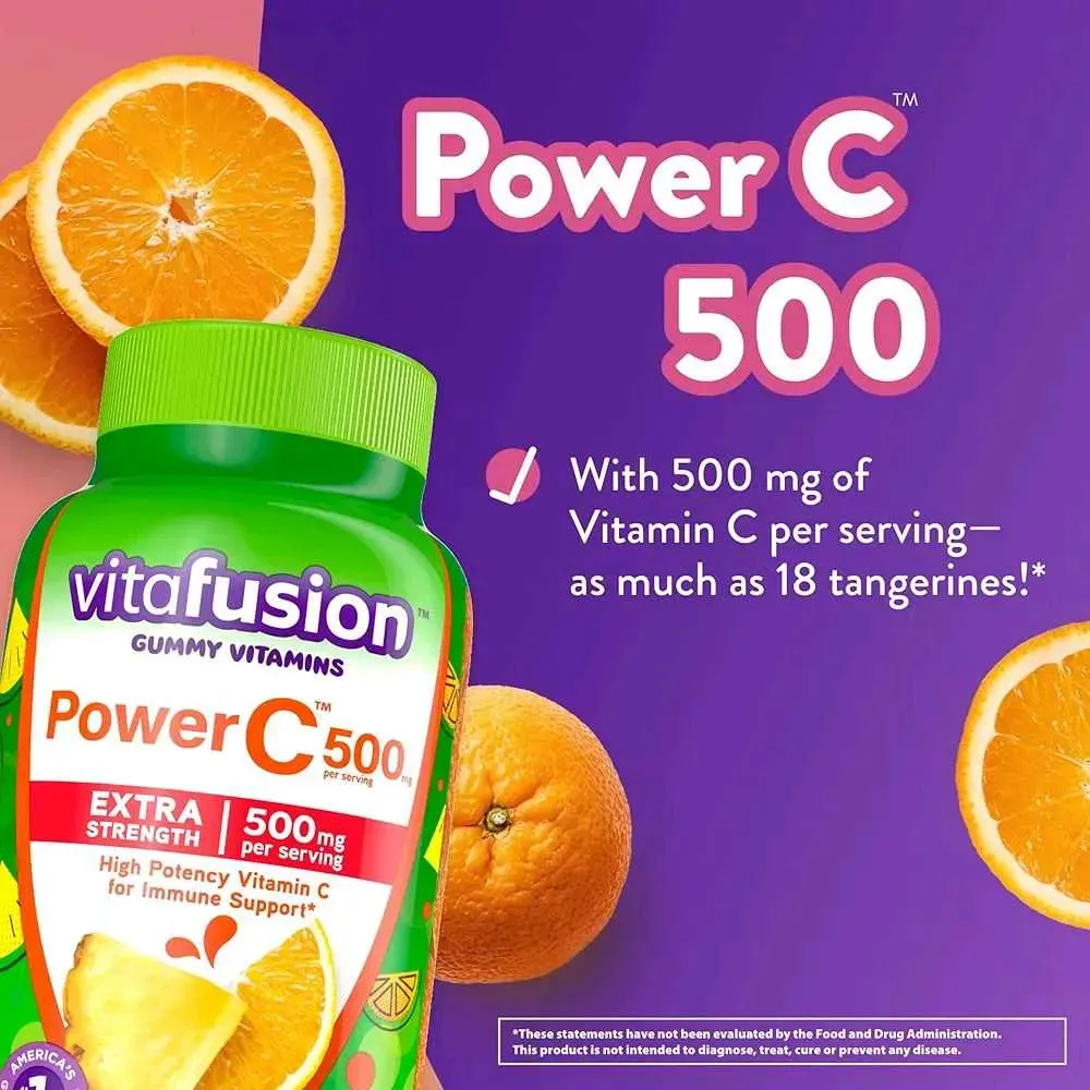 vitafusion Las vitaminas de gomitas Extra Strength Power C son suplementos dietéticos diarios que proporcionan vitamina C de alta potencia. Cada porción de gomitas de vitamina proporciona 500 miligramos de vitamina C para apoyo inmunológico (1) y tanta vitamina C como 18 mandarinas. Cada vitamina go...
