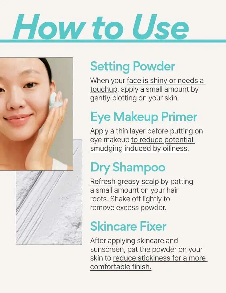Este polvo suelto multiusos, enriquecido con minerales de Jeju, absorbe el exceso de grasa y fija el maquillaje para lograr un aspecto suave y mate. Su tamaño portátil y la borla para polvos incluida facilitan su aplicación, incluso cuando estás fuera de casa.