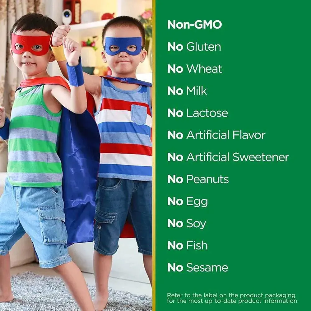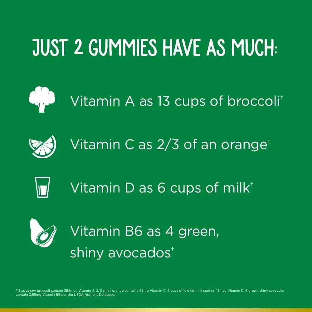 Nature's Bounty Las gomitas multivitamínicas Marvel® Avengers Kids se parecen a los héroes favoritos de todos los Vengadores y saben muy bien. Los niños de 4 años en adelante obtienen tanto: vitamina A como 13 tazas de brócoli, vitamina C como 2/4 de una naranja, vitamina D como 6 tazas de leche y v...