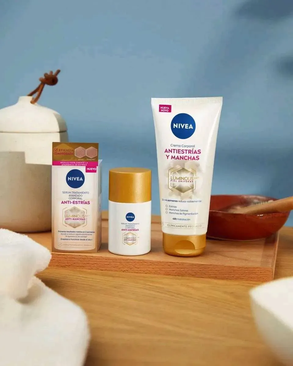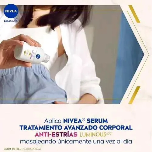 NIVEA Serum Corporal Anti-estrías con LUMINOUS630 unifica el tono de la piel y reduce visiblemente las estrías, además de prevenir nuevas marcas.