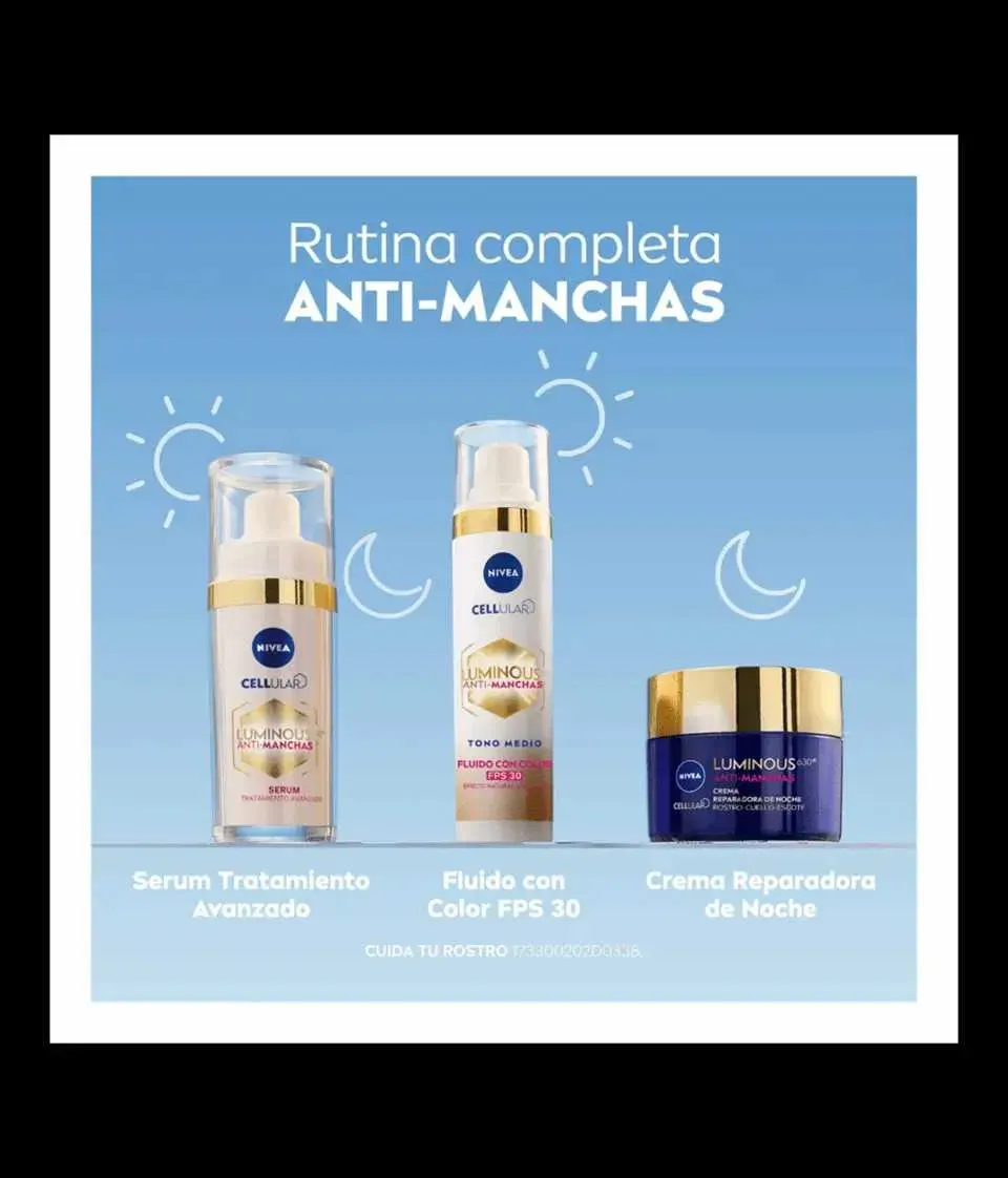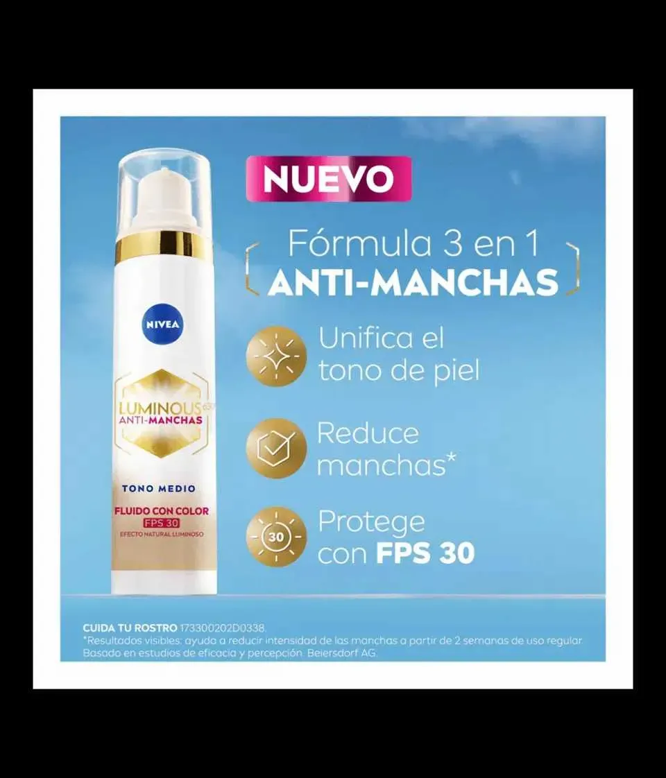 El nuevo NIVEA LUMINOUS630® Anti-Manchas Fluido con Color Tono Medio FPS30 unifica el tono de la piel gracias a su triple acción: Unifica dejando un efecto natural luminoso, reduce visiblemente las manchas a partir de 2 semanas, protege la piel contra rayos UVA/UVB y ayuda a prevenir la reaparición ...